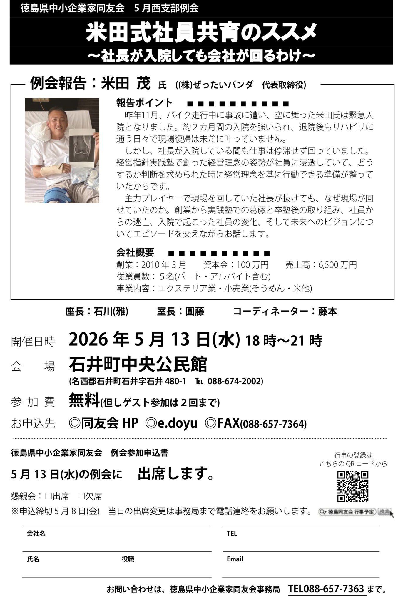 2026 3/2 3月北支部例会お知らせ テーマ:それでも私は諦めない! ~想いが理念になり、覚悟に変わった日~ 報告者:細井 里奈 氏 一般社団法人そらいろ 代表理事 開催日時 2026年3月2日(月) 18時~21時会 場 鳴門うずしお会館・Zoom併用 詳細はこちら